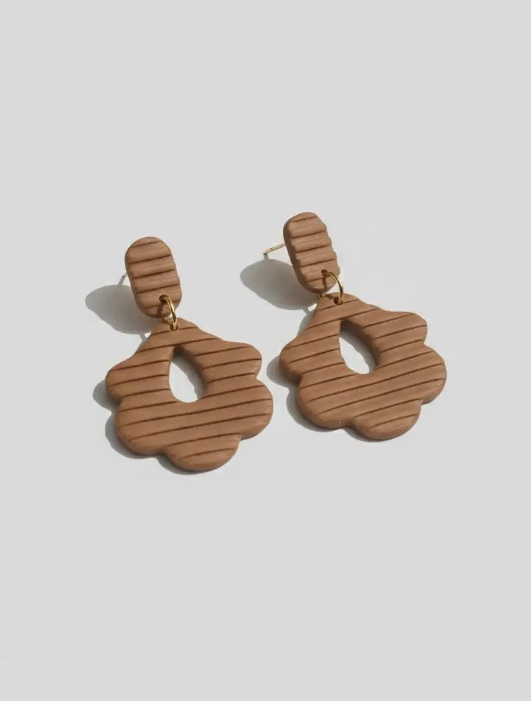 Ręcznie wykonane kolczyki w ciepłym odcieniu, wyróżniające się unikalną, prążkowaną teksturą. Wykonane z gliny polimerowej, mimo swoich rozmiarów pozostają lekkie i niezwykle komfortowe w noszeniu. Wyposażone w sztyfty ze stali chirurgicznej, są w pełni bezpieczne dla wrażliwej skóry. Ich całkowita długość to 4,7 cm.