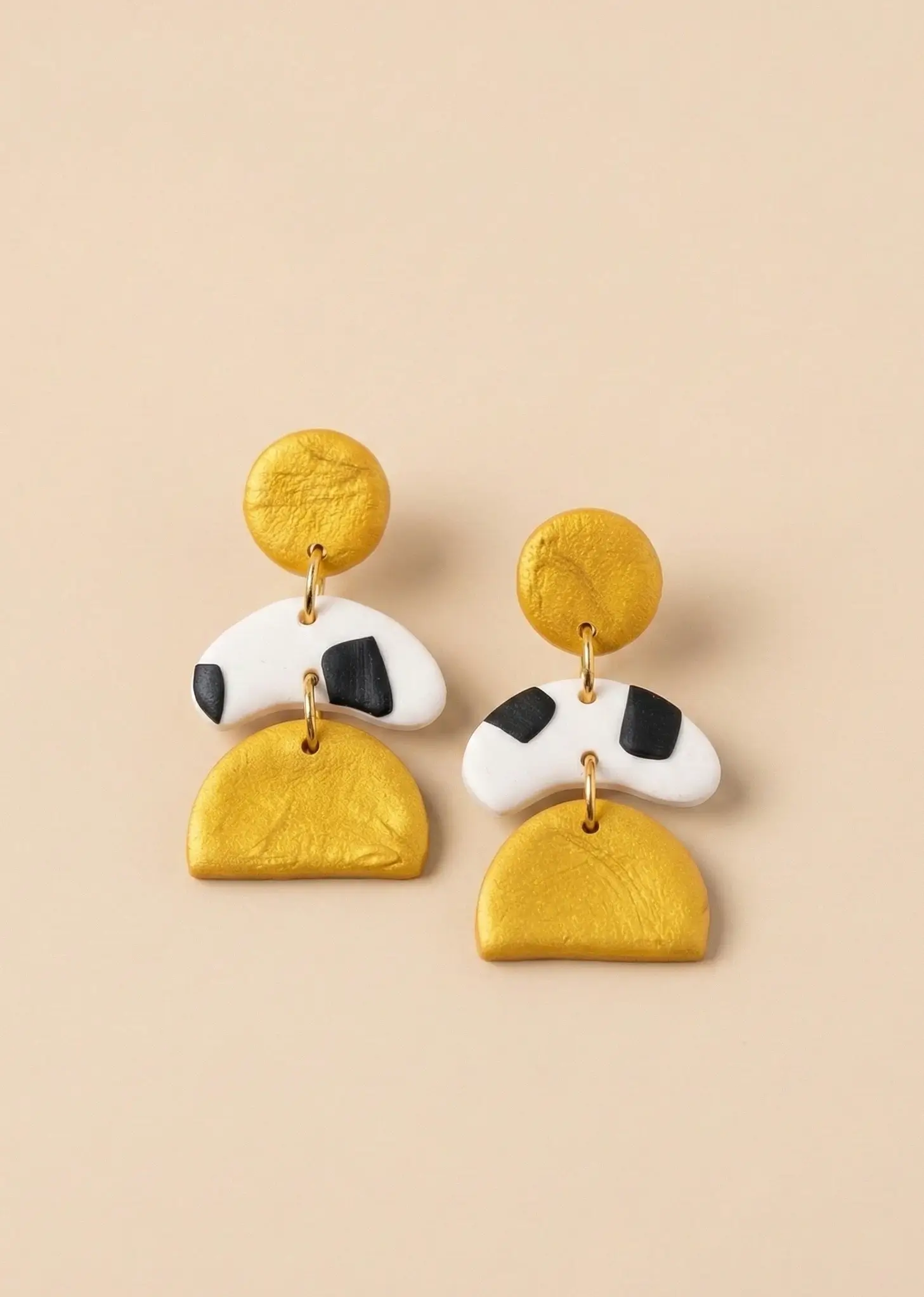 Wyjątkowe kolczyki o wysokości 3,7 cm, które stanowią odważne połączenie klasycznego złota z nowoczesnym, abstrakcyjnym wzorem. Ręcznie wykonane z niezwykle lekkiej gliny polimerowej. Ich geometryczna, trzyelementowa konstrukcja sprawia, że biżuteria pięknie pracuje przy każdym ruchu głowy, pozostając jednocześnie niemal niewyczuwalną na uszach. Dzięki zastosowaniu  sztyftów ze stali chirurgicznej kolczyki są  bezpieczne dla wrażliwej skóry.