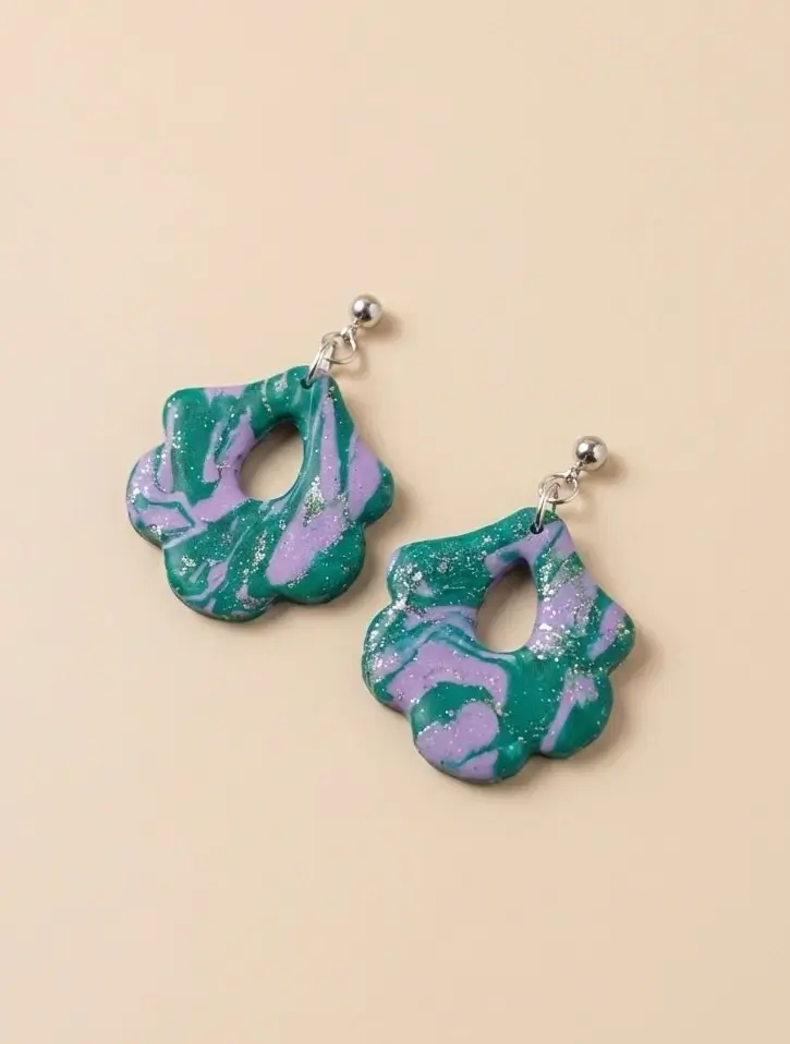 Ręcznie wykonane kolczyki o unikalnym, florystycznym kształcie z efektownym, łezkowatym wycięciem. Marmurkowy wzór łączy w sobie głęboką zieleń z pastelowym fioletem, a cała powierzchnia została rozświetlona mieniącymi się drobinkami srebrnego brokatu. Wysokość elementu z gliny polimerowej wynosi 3 cm, natomiast całkowita długość kolczyka to 4 cm. Dzięki zastosowaniu lekkiego materiału oraz  sztyftów (kuleczek) ze stali chirurgicznej, biżuteria zapewnia najwyższy komfort noszenia i jest bezpieczna dla wrażliwej skóry.